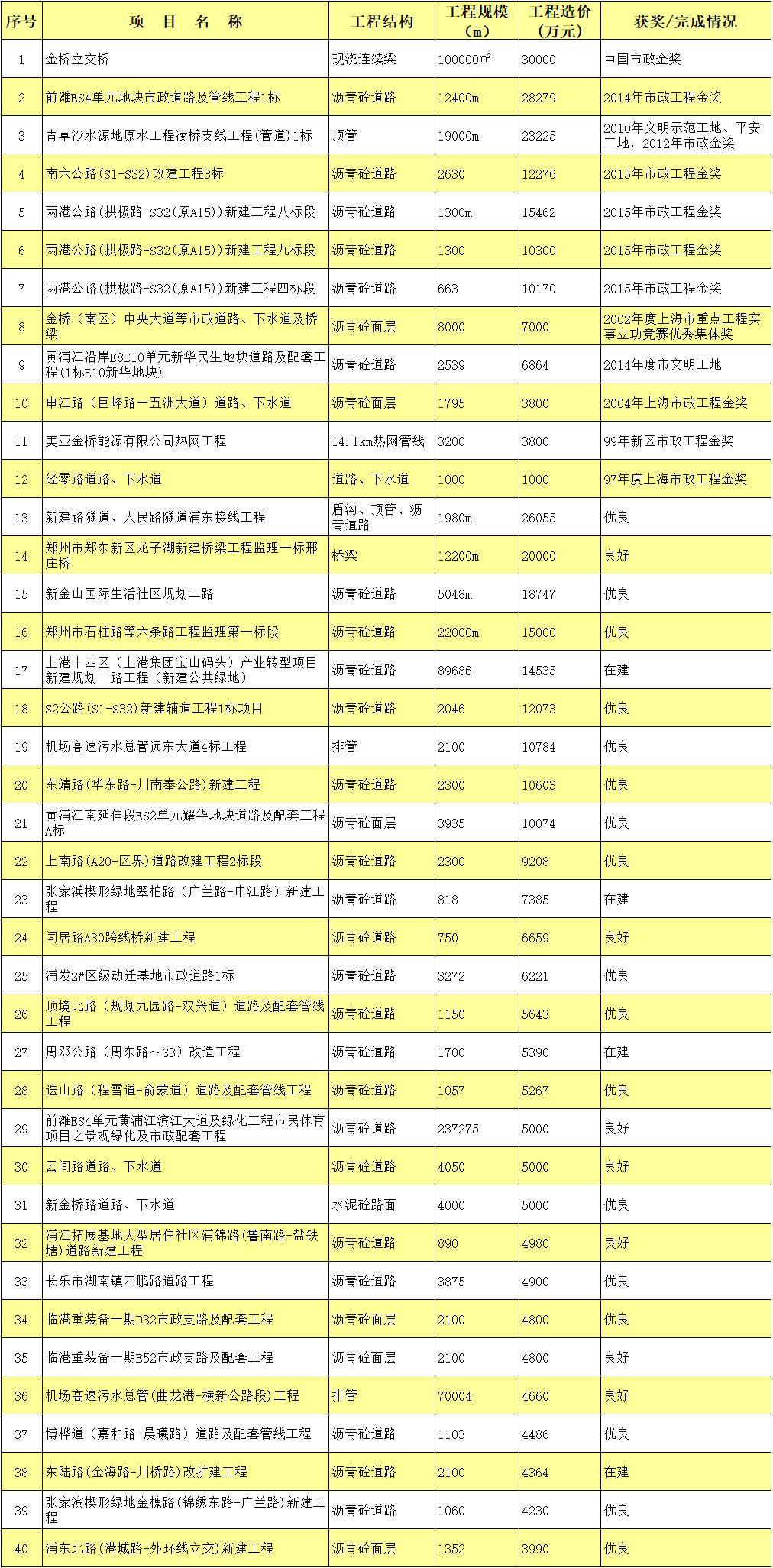 部分市政工程监理项目业绩一览表