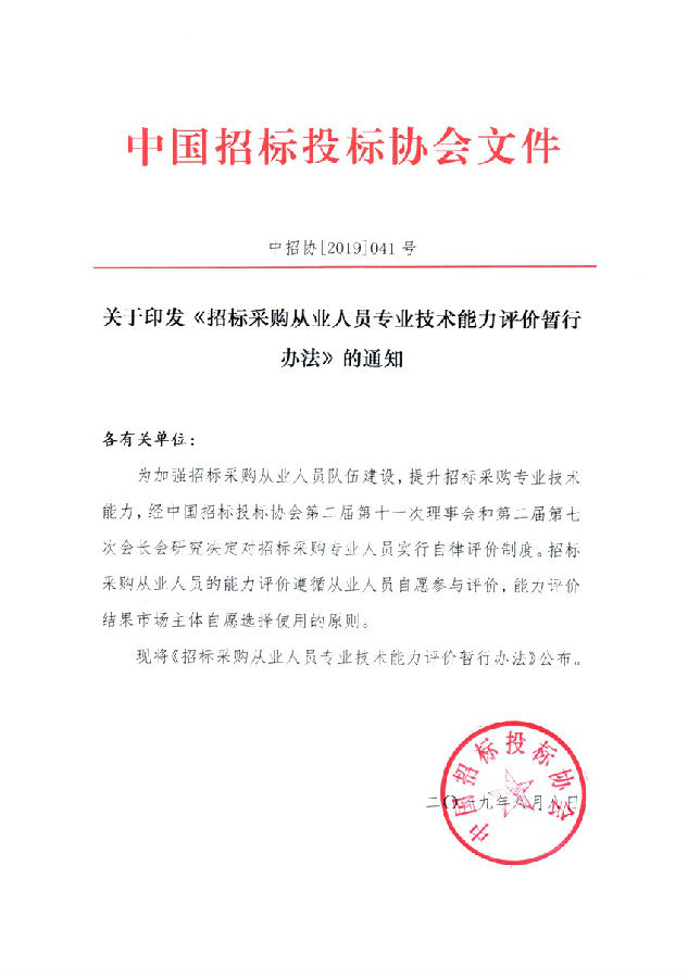 关于印发《招标采购从业人员专业技术能力评价暂行办法》的通知【中招协[2019]041号】